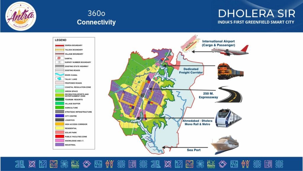 Dholera SIR (Special Investment Region) is India’s first greenfield smart city with a brand new metropolis built from scratch on open land. Spanning 920 sq. km (bigger than the city of Singapore), it’s envisioned to be a modern urban hub with world-class infrastructure and a high standard of living for residents. Located about 100 km south-west of Ahmedabad in Gujarat, Dholera is the largest node on the Delhi–Mumbai Industrial Corridor, positioned to become an economically and socially balanced new-age city. In short, Dholera SIR is a city designed for tomorrow, taking shape today with the goal of offering investors and residents a smart, sustainable, and thriving community.